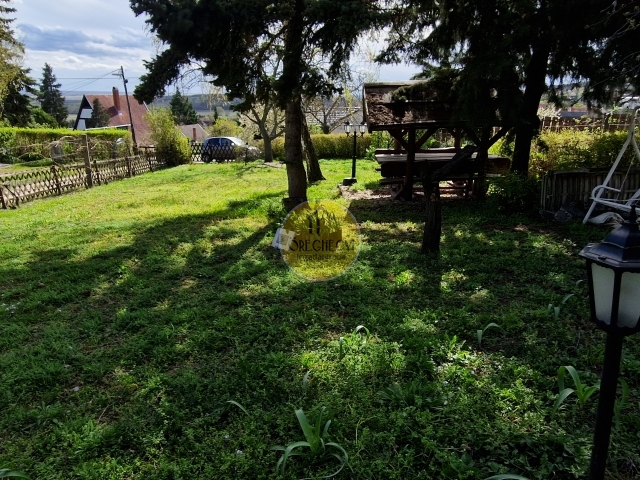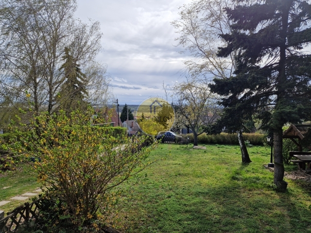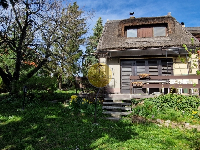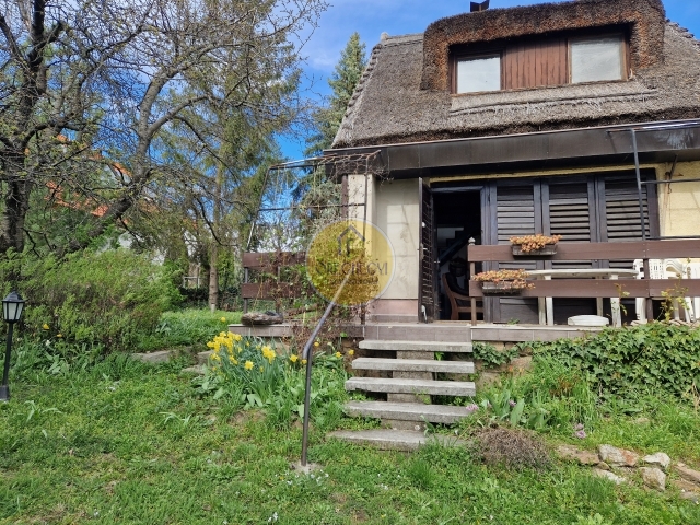 Eladó Sukoró üdülő övezetében - állandó lakhatásra használt ingatlanok szomszédságában - egy tégla építésű, nád tetős, tetőtér beépítésű 75 m2-es lakóház 523 m2-es örök panorámás - Velencei tóra - telken.